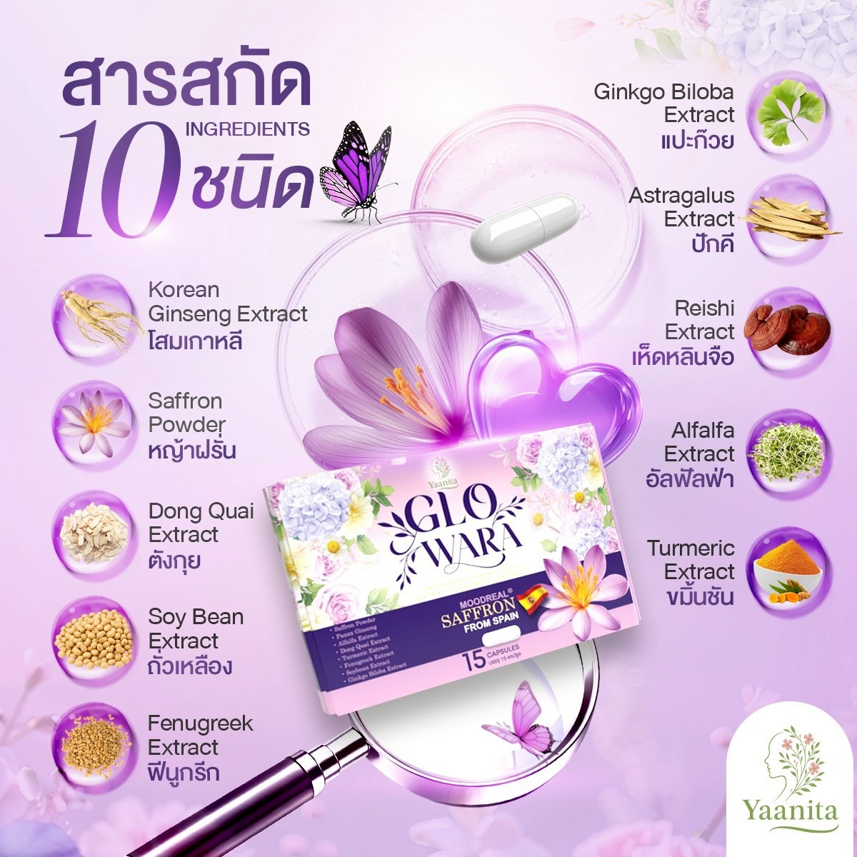 📍 สารสกัดสุดพรีเมี่ยมใน GLOWARA รวมถึง 10 ชนิด ได้แก่